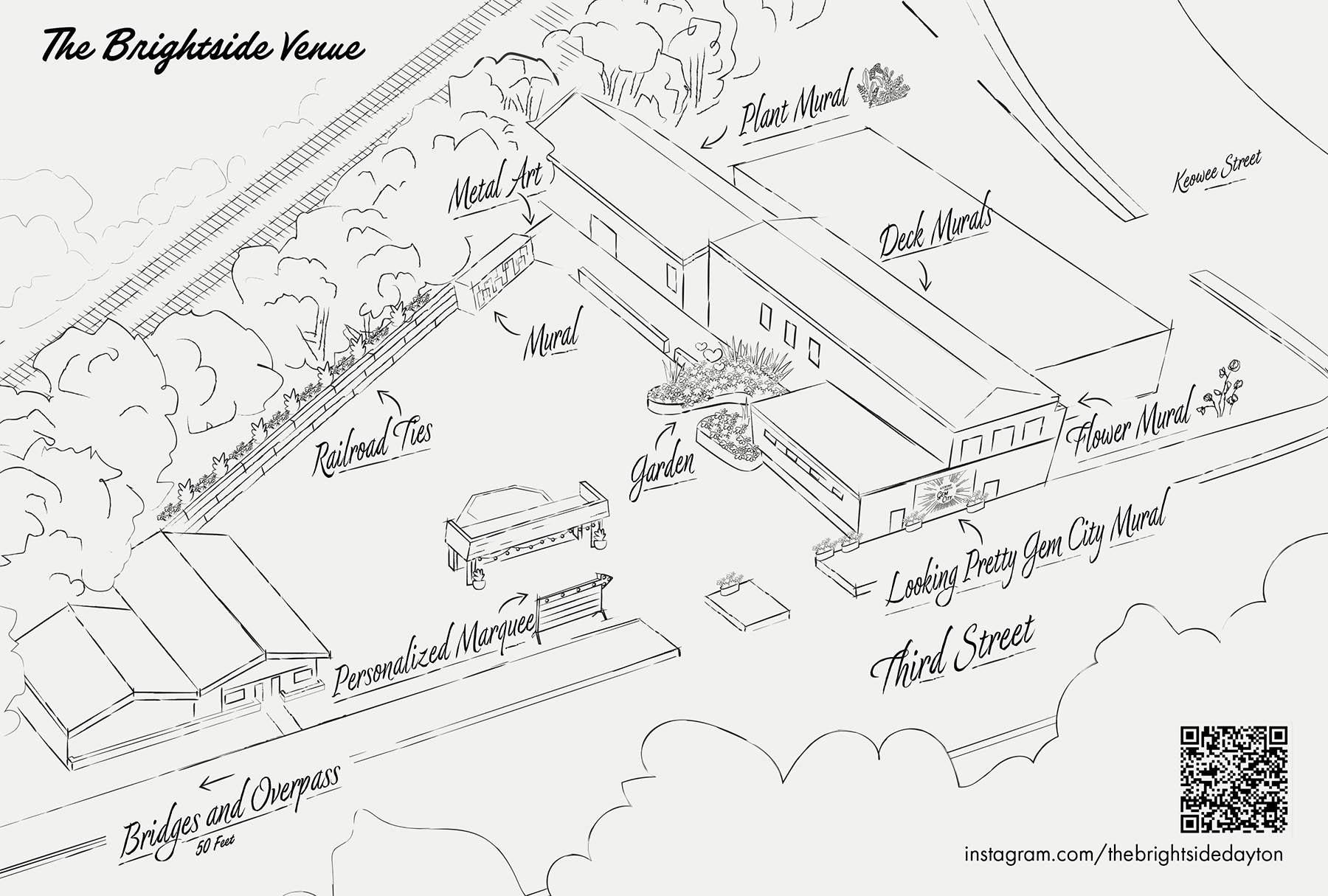 Yep, you read that right! We've mapped out all the coolest spots around our property where you can capture those perfect wedding photos. From funky murals to serene gardens, and even a rooftop deck with a swing – we've got it all within a short walking distance. That's not even counting all the awesome indoor photo spots we have right here at The Brightside.